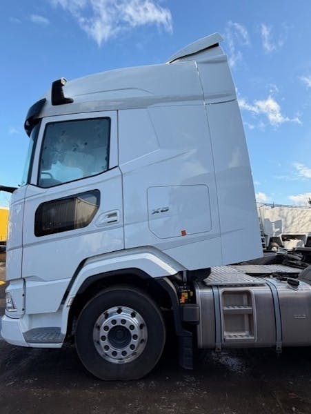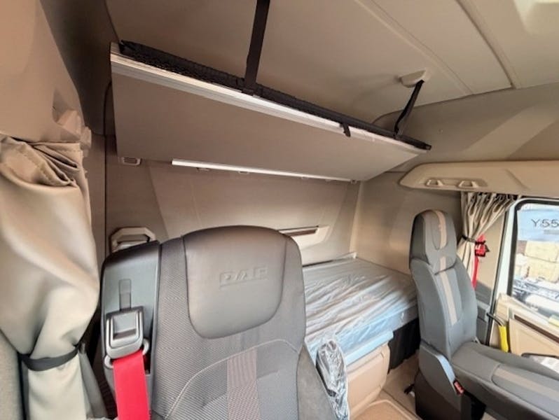 Ready to Go High Specification Unit, MX13 530hp, 4.15m wheelbase, Dura-Brites Available immediately, excellent value and high specification. Cab exterior - XG cab - Chassis front execution: bottom plate - Cab suspension mechanical - External sun visor - Cab step rigid - Air horns, prepared - LED head, cornering and fog lights - Head lights without levelling device - Head light beam for left-hand traffic - LED daytime running lights - LED Skylights; aux. LED lights on cab rf, prepared - Two LED work lamps for cab rear wall - Hazard beacons on cab front, prepared - Grip + surround + side wall: cab colour - Front windscreen - Kerb view window co-driver door - Tempered glass - DAF Digital Vision System - DAF Corner View - Rear view camera - Central door lock system, 3 keys, 2 RC units Aerodynamics - Adjustable roof air deflector for XG cab - Side collars, both sides hinged Colours - Cab colour: E1980WHTE - Lower cab step Crystal White - Colour roof air deflector: Crystal white - Colour of side collars: Crystal white - C4P500GRY Chassis colour grey - Colour of housing DDVS: Crystal White - Colour of head lamp panel: Crystal White - Colour of bumper: Crystal White Cab interior - Right-hand drive (RHD) - Steering wheel, leather - Cab interior trim colour: Exclusive - Dashboard finish: Plateau - Cab interior decoration: Natura - Door covering: soft woven fabric - Cab wallcovering textile - Driver seat: Super Air - Arm rest at both sides of the driver seat - Driver seat, swivel base - Co-driver seat: cinema + table; fabric cover - Co-driver seat, fixed base - Seat belts red - Dashboard table - Storage compartment with drawer in centre - Two refrigerators - Preparation for air blow gun - Xtra Comfort mattress with topper for lower bunk - Luggage carrier - Protection net upper bunk / luggage carrier - Curtains, without dividing curtain - Interior LED lighting - Automatic Temperature Control and airco - Aux cab heater with residual heat pump and timer - Pollen filter - Roof hatch, electric control - Window openers: electric - Accessory power supply: standard + 2x 40A - ECAS remote control Communication and driving management - FMS connector extended, prepared - PACCAR Connect with navigation and tablet software - Tachograph digital, VDO version G2V2A - Speed limiter setting 90 km/h - Infotainment incl. DAF Truck Nav. and tablet prep. - Speakers: Exclusive - Antennas: radio, 2x cellular, GNSS - Adaptive Cruise Control with FCW and AEBS-3 - Predictive Cruise Control - Driver Performance Assistant - Wireless charger Safety and security - Speed limit recognition - DAF drowsiness detection - Lane Departure Warning System - Vehicle Stability Control (VSC) - Reverse warning - Basic immobiliser - Main switch chassis - Drive-off Assist - DAF Side & Turn Assist - City Safety Package - Alcohol interlock, prepared - Compliant with UN Regulations R155 and R156 Suspension and axles - Front: 8.00 t, parabolic, 165N - Front axle 1, 8000 kg, tyre load index 156 - Front axle 2, 7500 kg, tyre load index 154 - Leading axle, steered - Second front axle 150N - Leading axle load 7.50t - Stabilink rear suspension - Rear axle load 12.10 t - Rear: 19.60 t, air suspension, SR1347 - Rear axle 1, 12300 kg, tyre load index 147 - Axle load ratio 11.5/7.1 - Load limiter 11.5 t - Single driving height position, standard height - Front suspension leaf: medium - Lifting device - Manual control lifting device Wheels and tyres - Front axle(s): 315/70R22.5 - Second front or leading axle: 315/70R22.5 - Driven rear axle(s): 315/70R22.5 - Goodyear - Tyre pressure monitoring - Alu Alcoa Dura-Bright 32 mm - Wheel protection rings silvergrey - F1,315/70R22.5GO EQMSU 158/150 L Steering ABA 3P - F2,315/70R22.5GO EQMSU 158/150 L Steering ABA 3P - R1,315/70R22.5GO EQMDU 154/150 L Traction ABB 3P - SP, not applicable Driveline - Engine MX-13, 390 kW/530 hp. Cab Badge: 530 - Exhaust emission Euro 6 - Eco performance - Engine idle shutdown, 5 minutes - Automated gearbox, TraXon, 12 speeds - 12-speed TraXon 12TX2620 DD, 16.69-1.00 - Manoeuvring mode - Traction aid 15.0 t - Automated gearbox with manual control - Full vers - Standard transport, Full version - Rear axle ratio 2.40 - Mechanical differential lock - ASR - OBD-E engine H6 fuel B7 Brake system - MX Engine Brake - Park brake control pneumatic with spoken warning - Spring brake cylinders on the first front axle - Compressor 2 cylinders with clutch - Driven rear axle with disc brakes Chassis - Wheelbase 4.15 m / rear overhang 0.99 m - Side member 260/7.0 mm, front reinforcement - Exhaust pipe horizontal, low - Exhaust discharge to the right-hand side - EAS unit RH, batt box in AE, 85L AB on mudgrd LH - 1 circuit steering system - EU steering certificate - Air tanks steel - 580 l alu fuel tank with step LH, height 700 mm - Fuel tank left - Front underrun protection (FUP) - Catwalk with step, extra long - Catwalk step left-hand side - Rear mudguards - Spray suppression - Two wheel chocks - Work lamp LED - Rear light with LEDs Drawbar and trailer equipment - JOST JSK36D slider pressed steel 263mm - King pin diameter 2 inches - Fifth wheel KA dimension 770 mm - Lead-up ramps - Pneumatic trailer connection C-type - El tr conn 24V/2x7 pins, cbls: 2x7 pins + EBS - Sliding fifth wheel: mechanical operation Bodies and preparations for bodying - Hardwired body signals and warnings - Hardwired engine speed control connector chassis - Preparation for aftermarket switches - Additional spare wiring - Air control preparation for tipper application - Application connector flexible - Tail lift connection Anderson - Chassis preparation standard Power take-off (PTO) - Hardwired gearbox PTO control,no first gearbox PTO 24V power supply - Alternator 150 A, batteries 2x 210 Ah AGM - Battery Energy Monitoring GVM and GCM - Chassis weight related technical GVM max 27000 kg - Driveline related max GCM 44000 kg class 2 Application conditions - Application class 10 - Standard noise level - Regular cab insulation - Maxim
